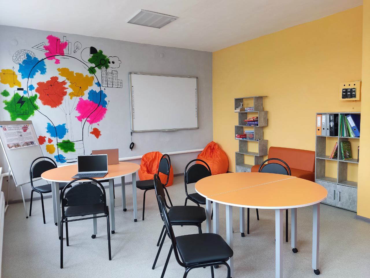 Центр Детских инициатив - это современное пространство, в котором ребята могут работать над совместными проектами и индивидуальными задачами, отдыхать в перерывах между занятиями. На выделенные из муниципального бюджета финансовые средства закуплена современная мебель и стеллажи, необходимая техника, удобные кресла-мешки, сделан косметический ремонт помещения.